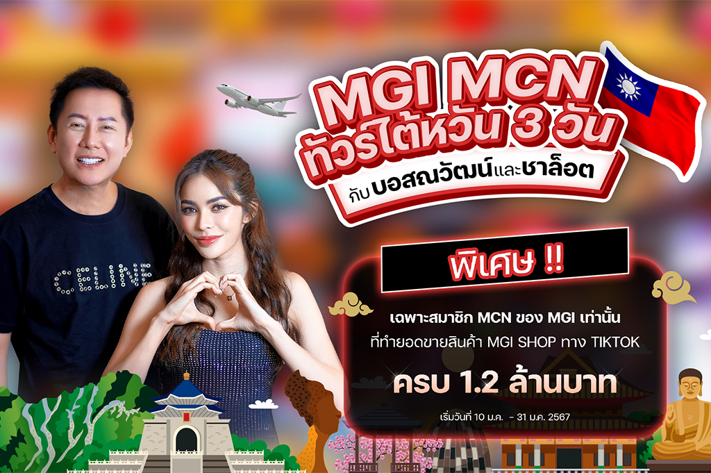 สุดพิเศษ เฉพาะสมาชิก MCN ของทาง MGI ที่สามารถทำยอดขายสินค้า “MGI SHOP”ผ่านแพลตฟอร์มของ “TikTok” ยอดถึง 1.2 ล้านบาท รับสิทธิ์ทัวร์ไต้หวันทันที สามารถร่วมกิจกรรมได้ตั้งแต่วันที่ 10 – 31 ม.ค. 2567