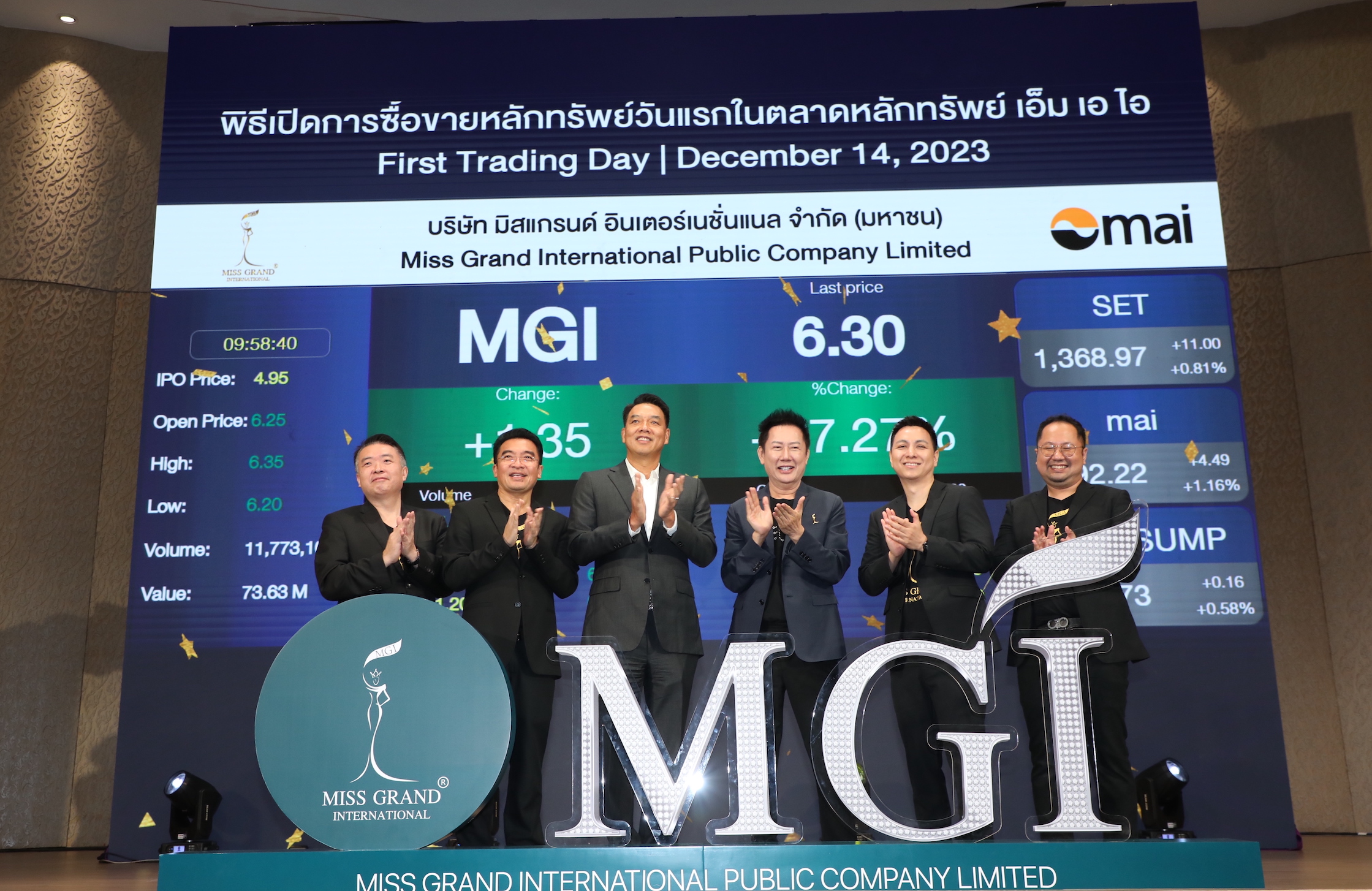 บริษัท มิสแกรนด์ อินเตอร์เนชั่นแนล จำกัด (มหาชน) หรือ MGI ผู้พลิกประวัติศาสตร์หน้าใหม่ให้นักลงทุนอีกครั้ง หลังเปิด IPO จำนวน 60 ล้านหุ้น ถูกจับจองหมดเกลี้ยงในพริบตา! ตอกย้ำ MGI แตกต่าง เป็นธุรกิจการพาณิชย์และเจ้าของเวทีประกวดนางงามในไทยรายแรกของโลกและของประเทศไทยที่เข้ามาจดทะเบียนในตลาดทุน ด้วยชื่อเวทีที่บริษัทเป็นผู้ก่อตั้งและเป็นลิขสิทธิ์ของบริษัทเอง ทำให้ MGI มีโมเดลธุรกิจและโครงสร้างรายได้ที่แข็งแกร่ง ไม่เหมือนบริษัทใดในตลาดทุน ล่าสุดทุ่มงบจัดงาน MGI First Trade หรือ “การซื้อขายหลักทรัพย์วันแรกในตลาดหลักทรัพย์แห่งประเทศไทย” ณ หอประชุมศาสตราจารย์สังเวียน อินทรวิชัย อาคาร C ชั้น 7 ตลาดหลักทรัพย์แห่งประเทศไทย ถนนรัชดาภิเษก สุดคึกคักและเต็มไปด้วยสีสันของ มิสแกรนด์ ไทยแลนด์ และ มิสแกรนด์ อินเตอร์เนชั่นแนล รวมถึง มิสแกรนด์ ประจำจังหวัดที่เดินทางมาร่วมงานและร่วมแสดงความยินดีกับ ผู้บริหารทุกท่าน และ อิงฟ้า วราหะ ,ชาล็อต ออสติน สองนางงามแกรนด์ผู้ถือหุ้นสูงสุดติดอันดับ TOP 10
