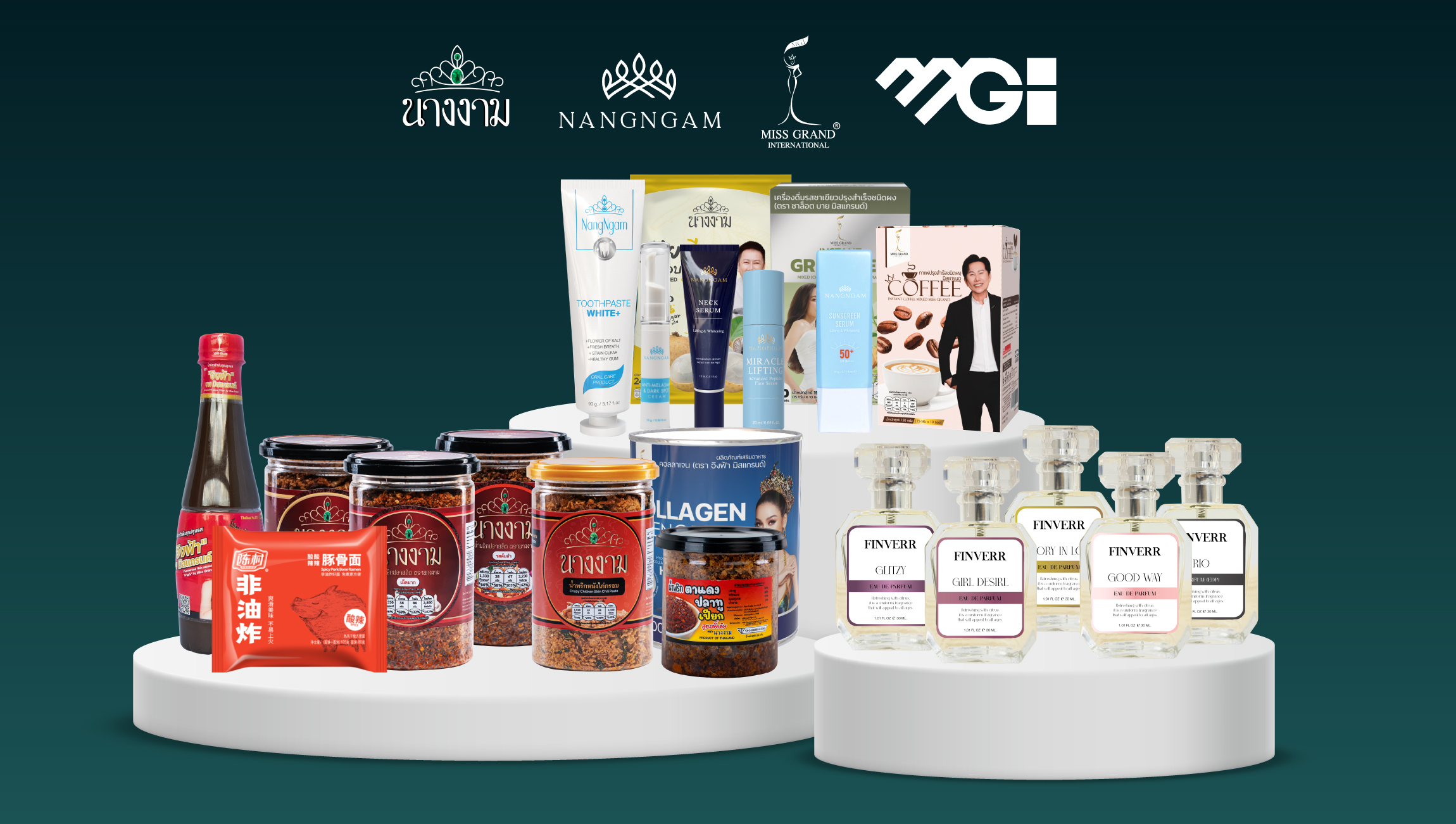 บริษัทฯ จัดจำหน่ายสินค้าในเครือแบรนด์ Miss Grand, NangNgam, นางงาม, MGI, Velora, Finverr, 24K รวมถึงร่วมพันธมิตรทางการค้ากับผู้ผลิตและผู้จัดจำหน่ายชั้นนำ เพื่อสร้างระบบนิเวศการค้าที่แข็งแกร่งและขยายการเข้าถึงผู้บริโภคทั้งในและต่างประเทศ